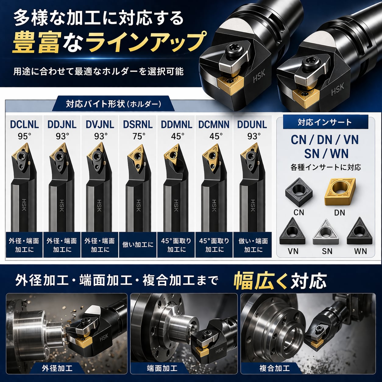 外径バイトホルダー HSK対応|DCLNL/DDJNL/DVJNL|旋盤バイト 高剛性・高精度|CN/DN/VN対応